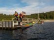 Efter en god frokost blev den nye redningsvest fremvist på ”flisen”. Nina fik som nyt medlem lov til at iføre sig den nye model. Trygfonden har sponsoreret 40 nye veste til klubben, så også her vil vi med de nye veste blive mere synlige.