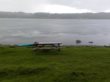 Frokost ved Kongensbro. Betty havde været i gang med at lave frikadeller af 5 kg fars, så der var også nogle til os sultne kajakfolk plus sild, æg og pølse. Det var et fint frokostbord på shelterpladsens bænkesæt.